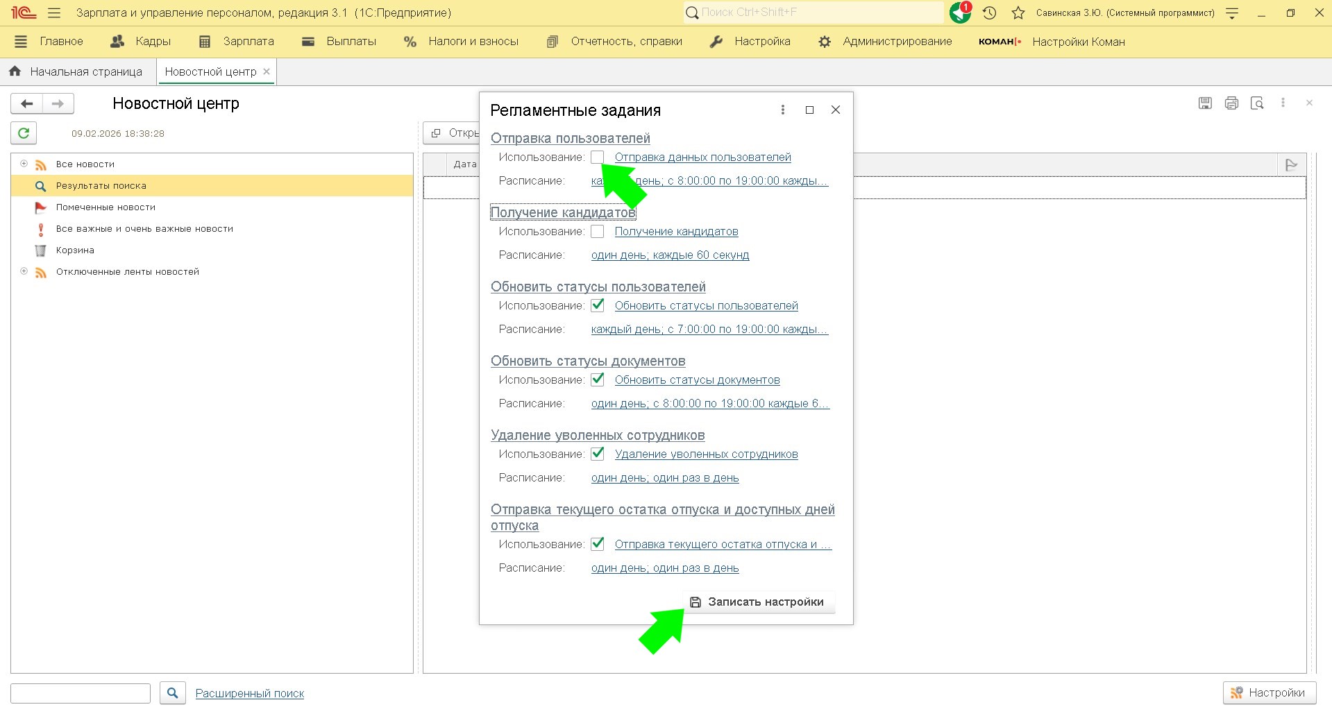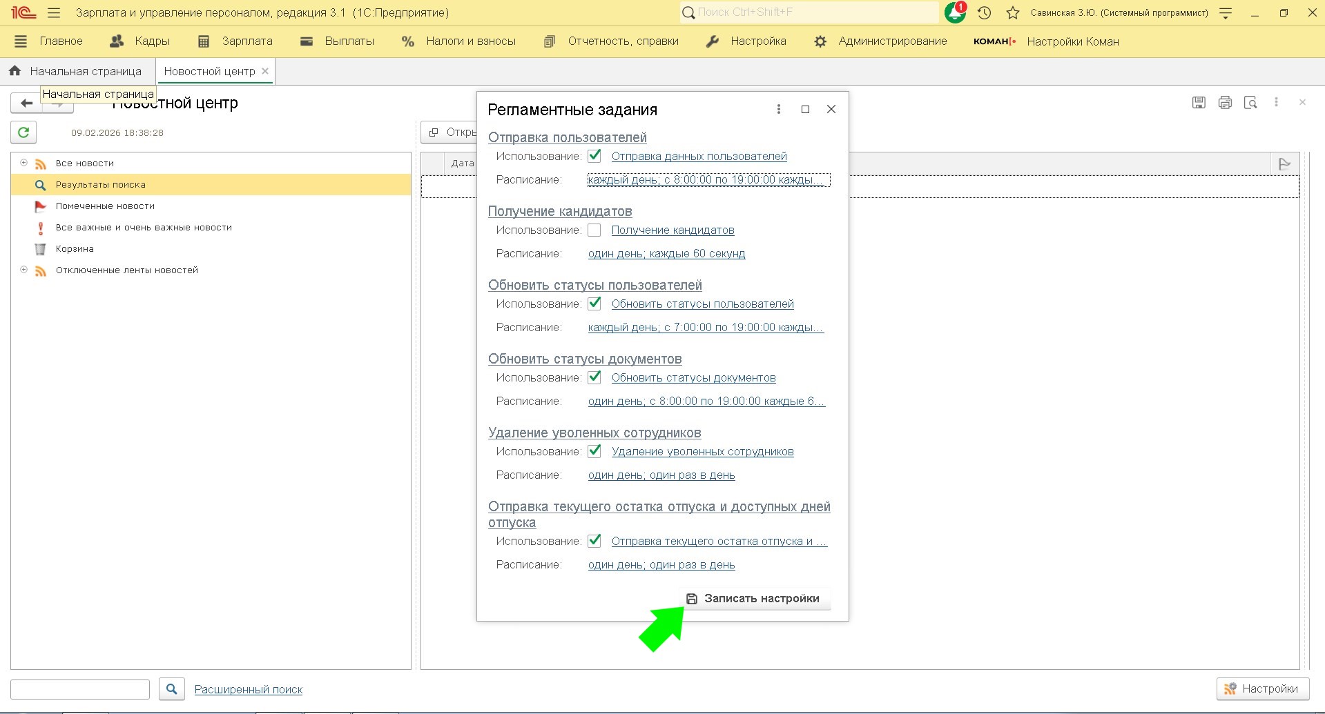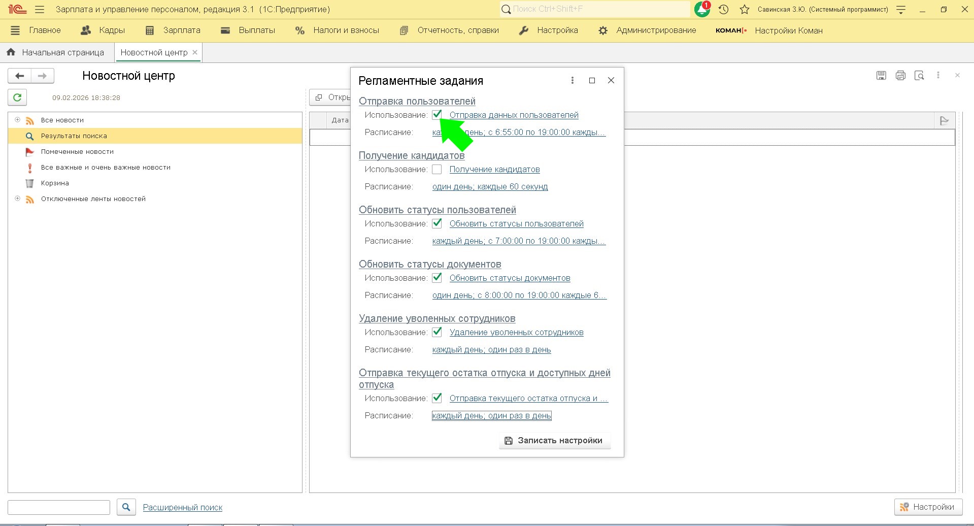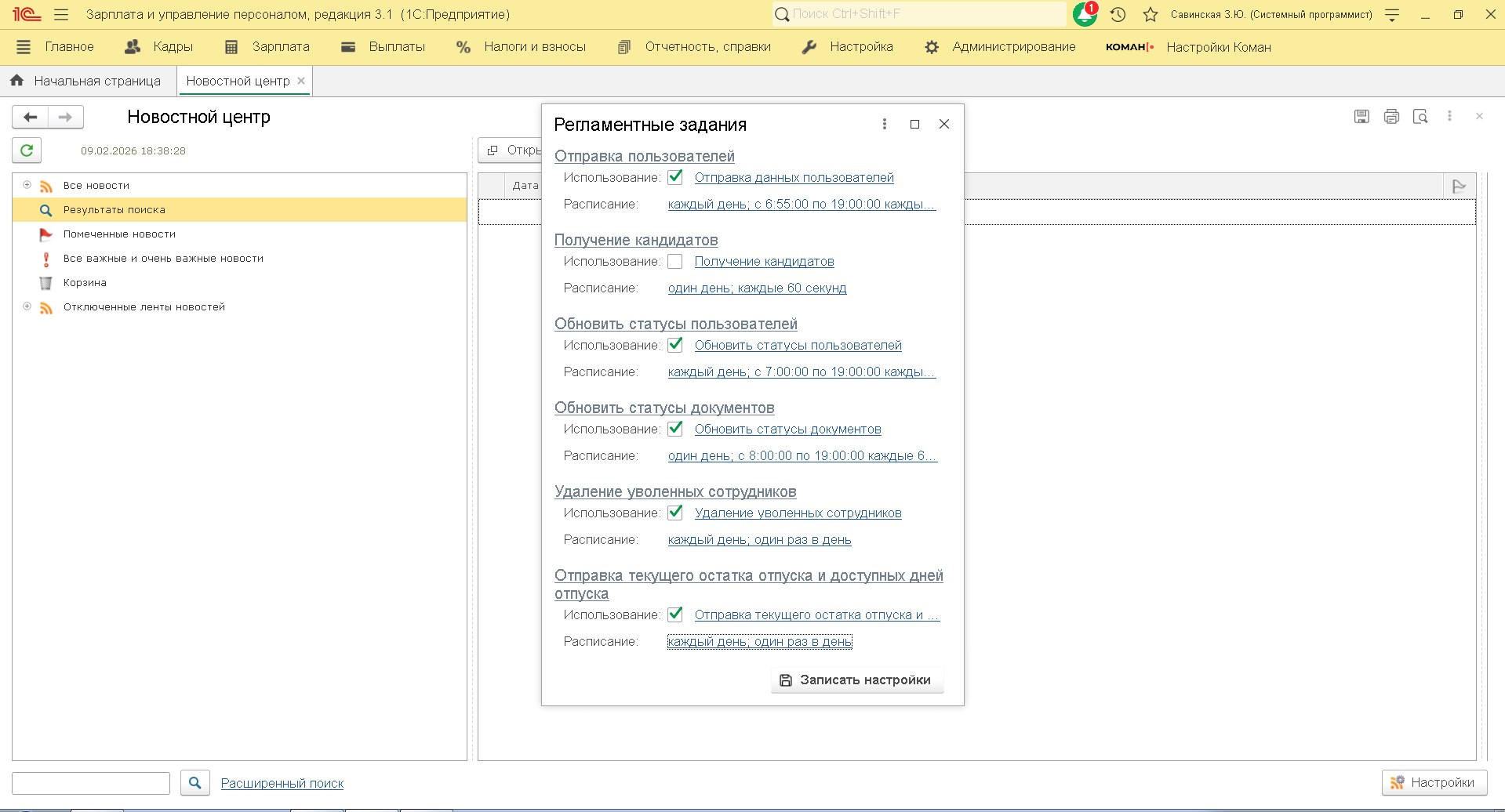 Регламентное задание предназначено для автоматической загрузки списка кандидатов в статусе "Готов к приему" из Коман. Список кандидатов отображается в "Обмен кандидатов".