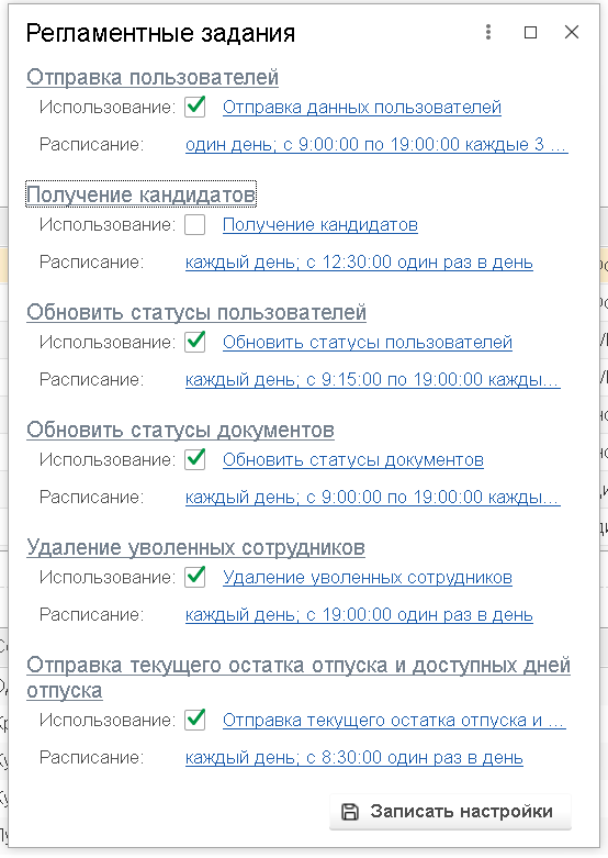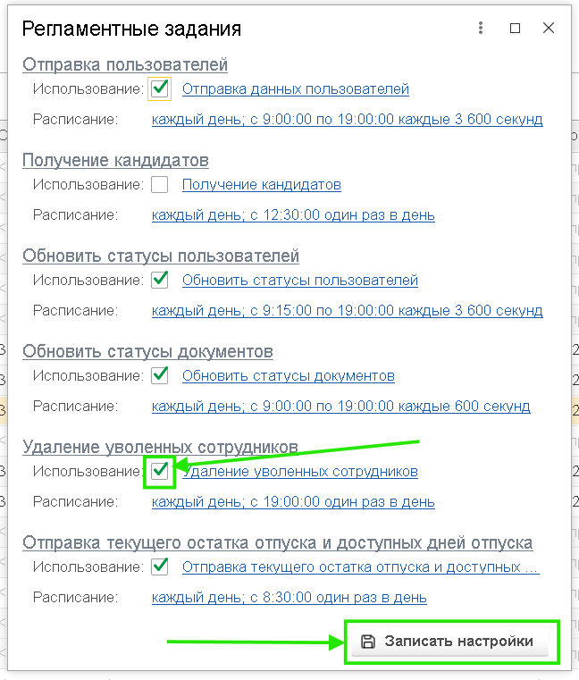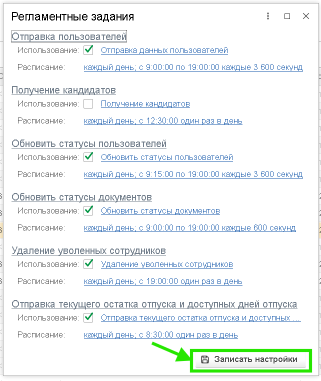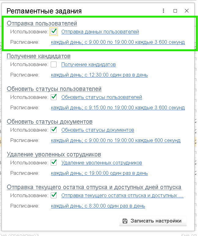Выключите флаг "Использование", чтобы отключить регламентное задание и нажмите "Записать настройки".