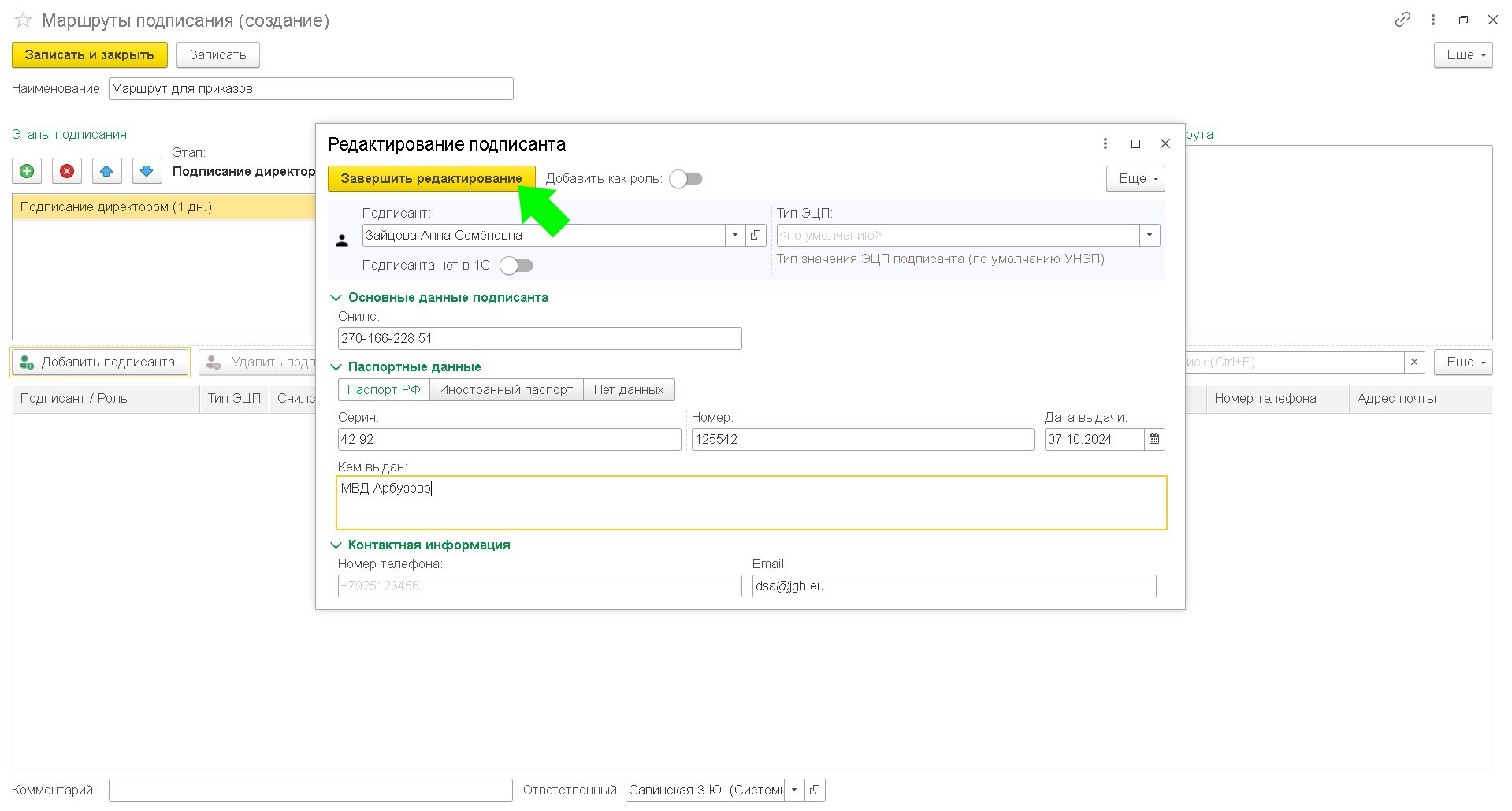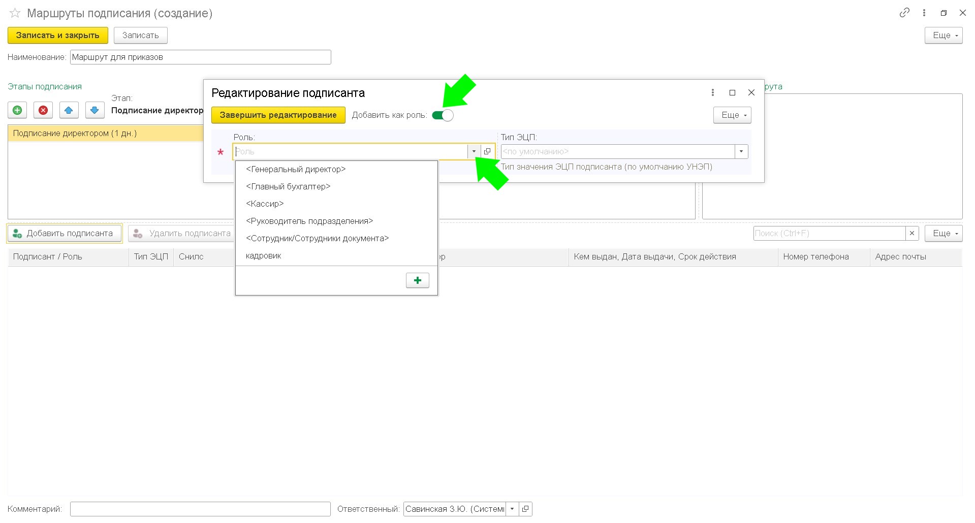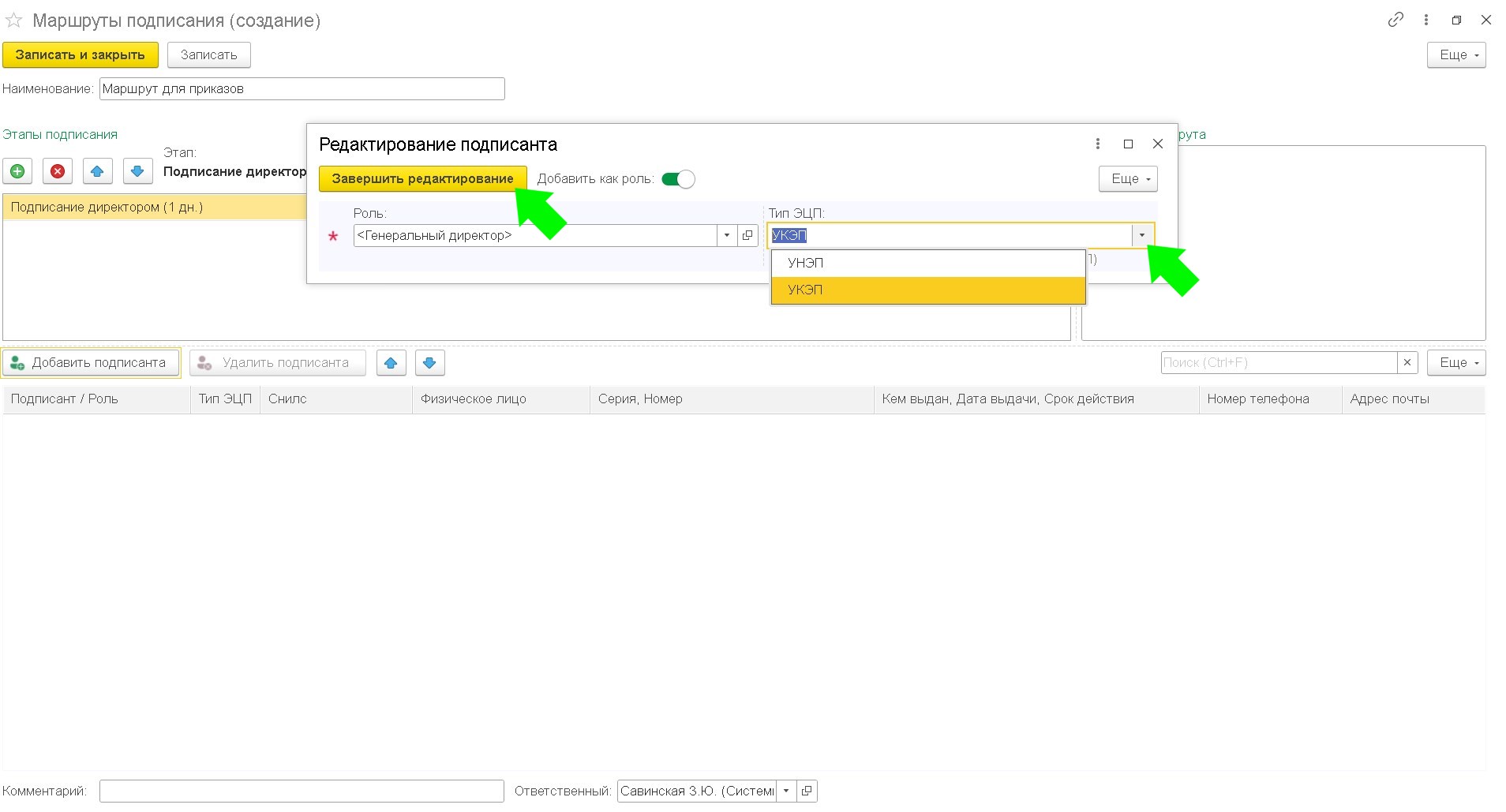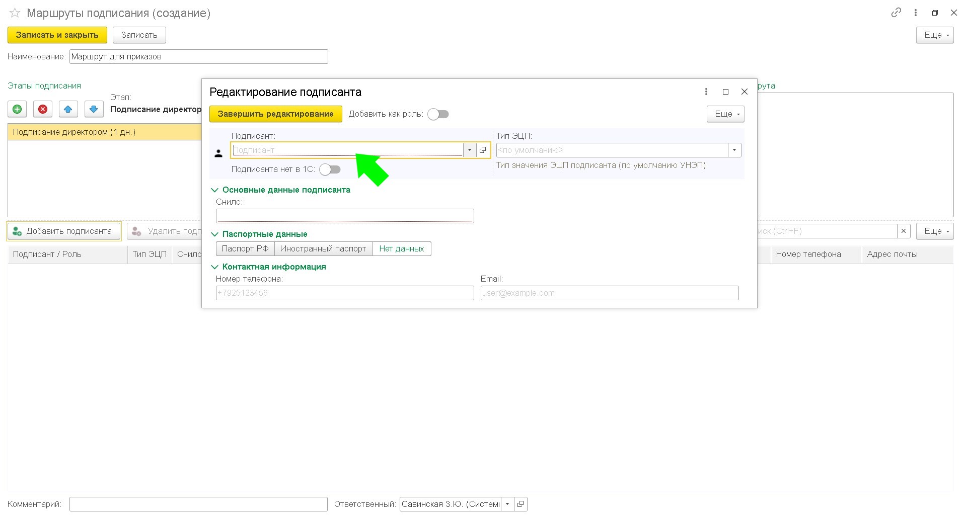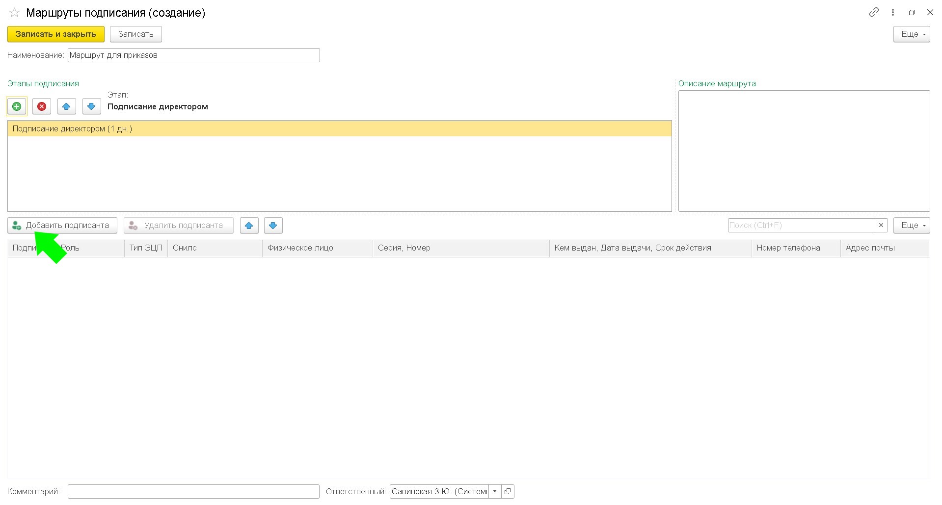 Чтобы записать маршрут подписания нажмите кнопку "Записать" или "Записать и закрыть"