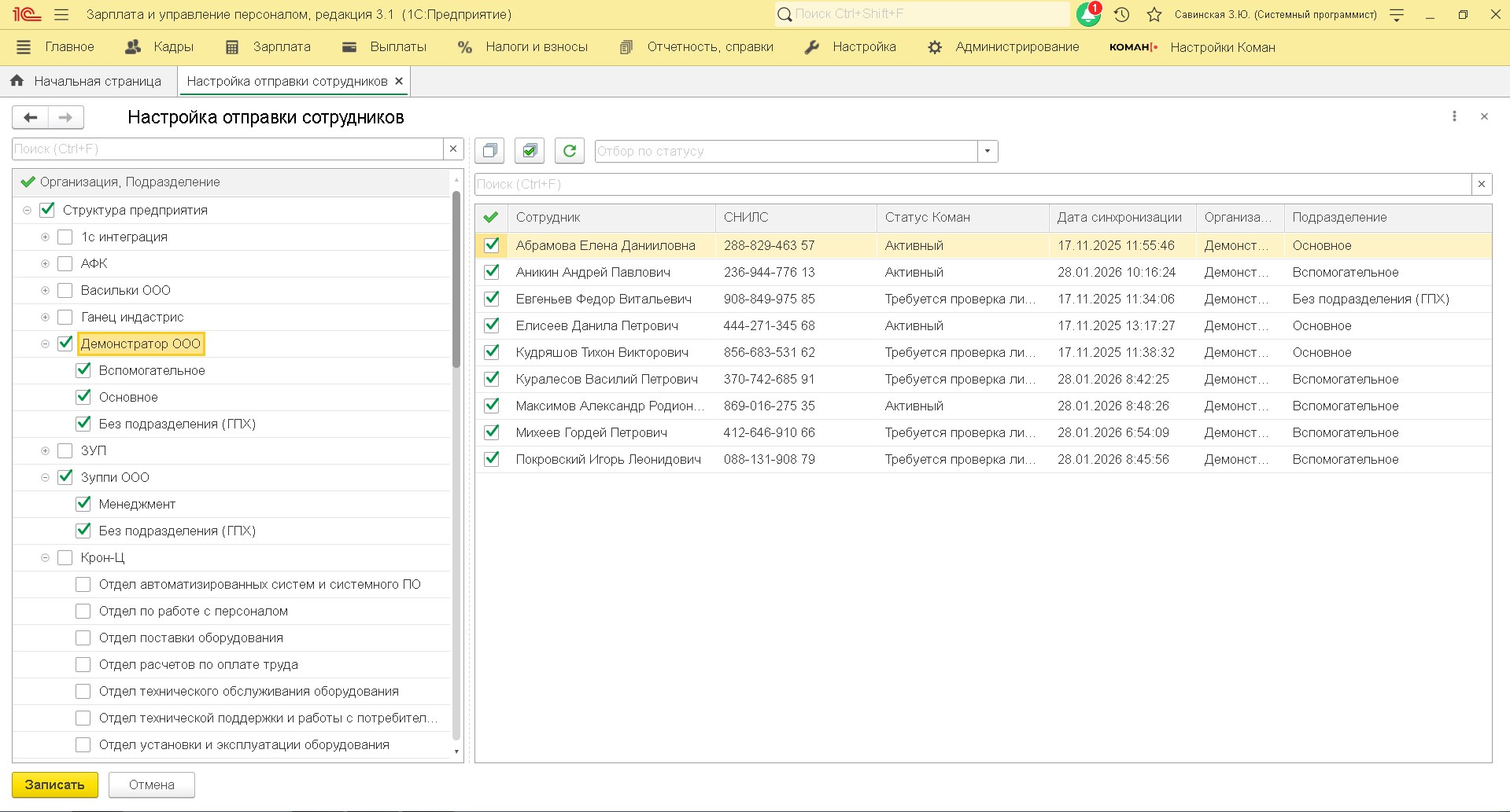 Данные по сотруднику будут отправляться в Коман только если одновременно включены галочки на подразделении (слева) и на сотруднике (справа).