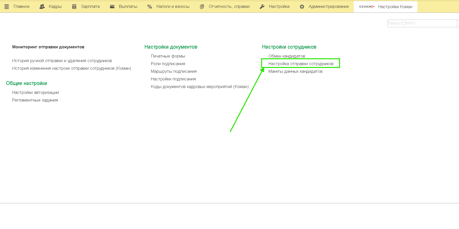 Зайдите в настройки Коман и выберите "Настройка отправки сотрудников".
