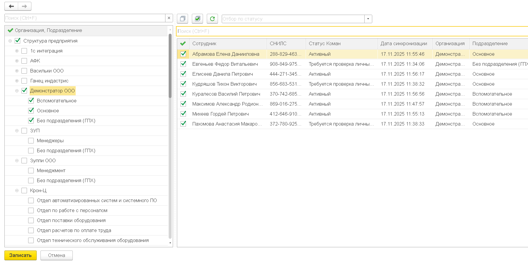 В правой части экрана отображается перечень сотрудников выбранной структурной единицы.