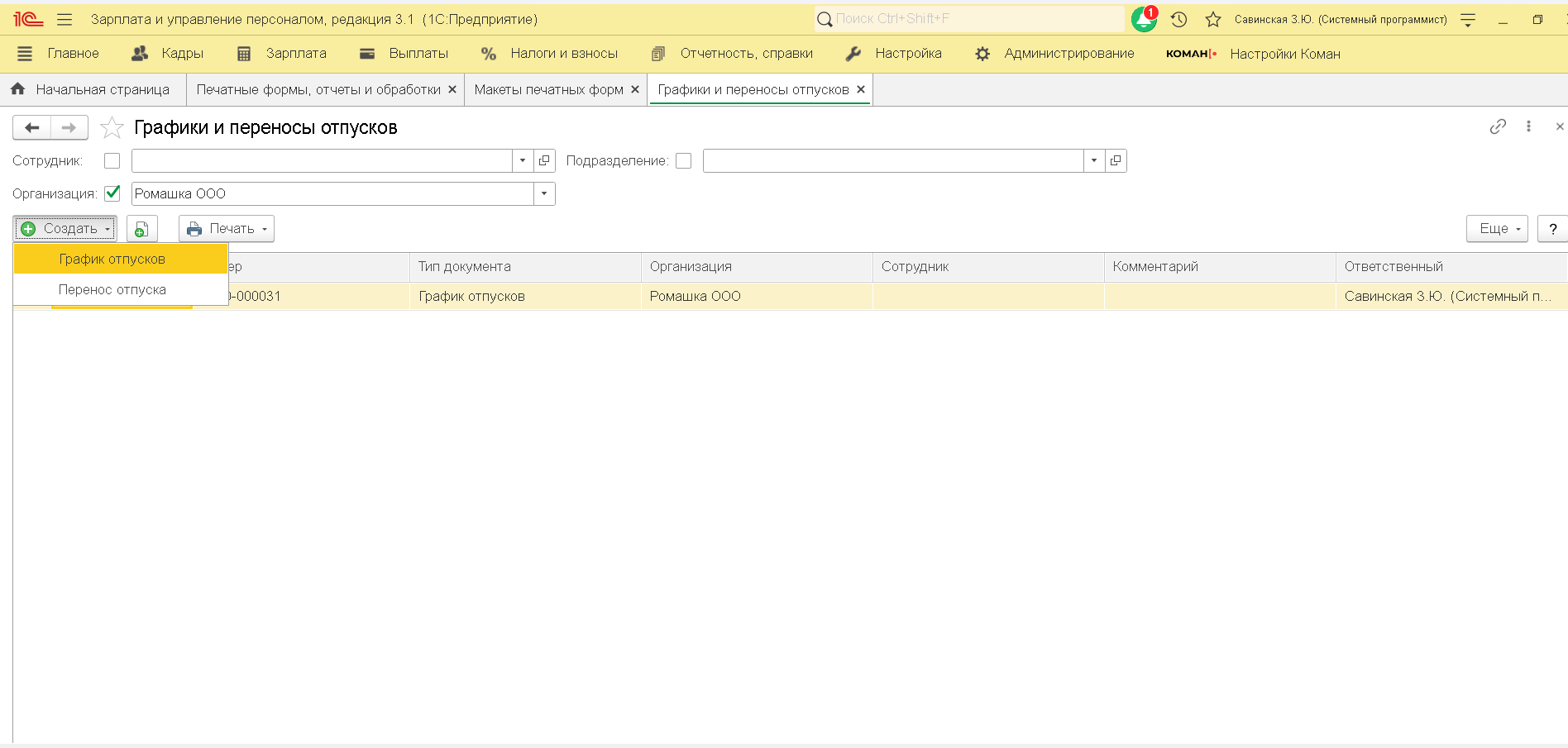 Создание графика отпусков из 1С соответствует правилам создания из Коман. Подробнее см. в Управление графиком отпусков