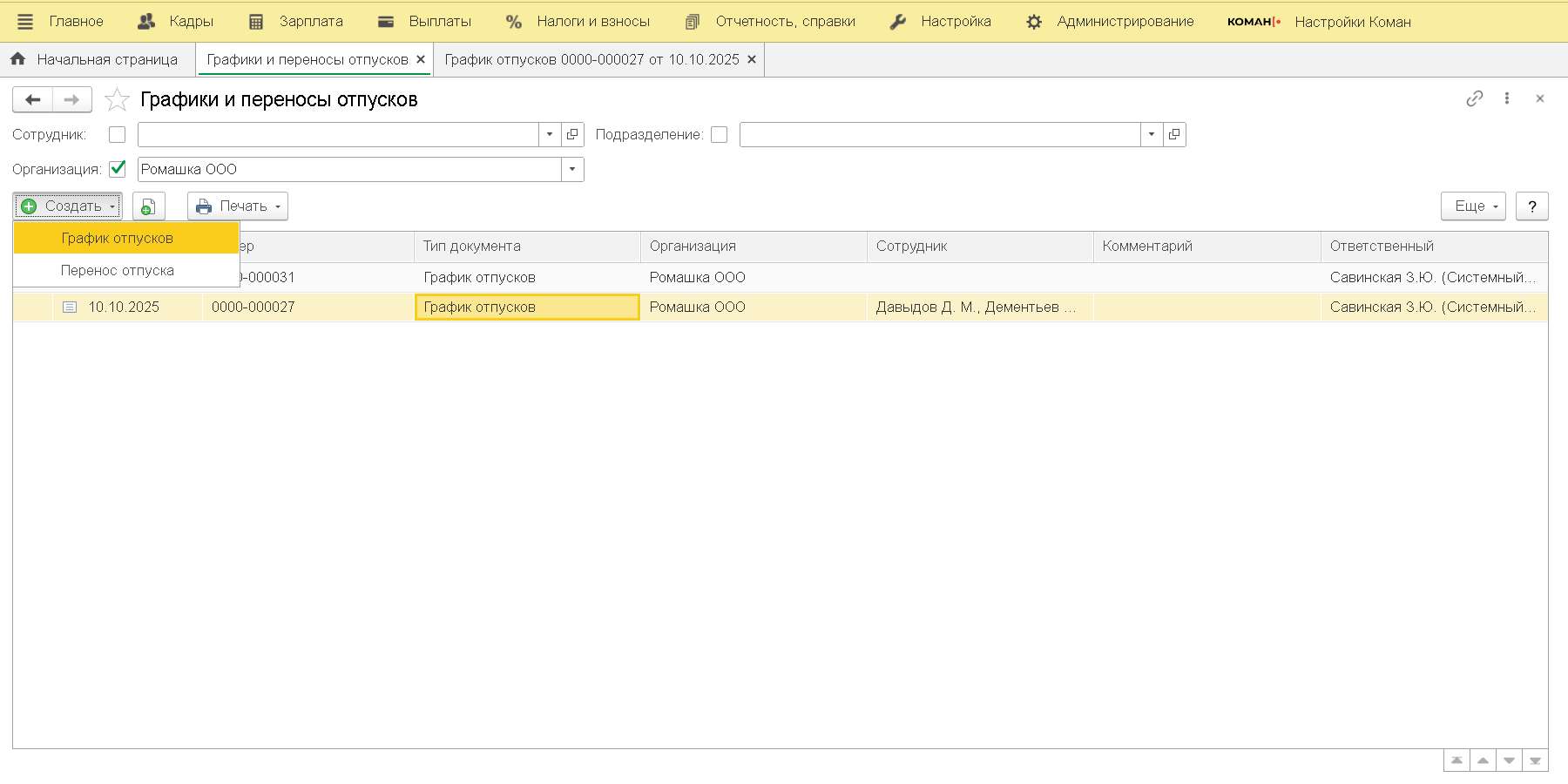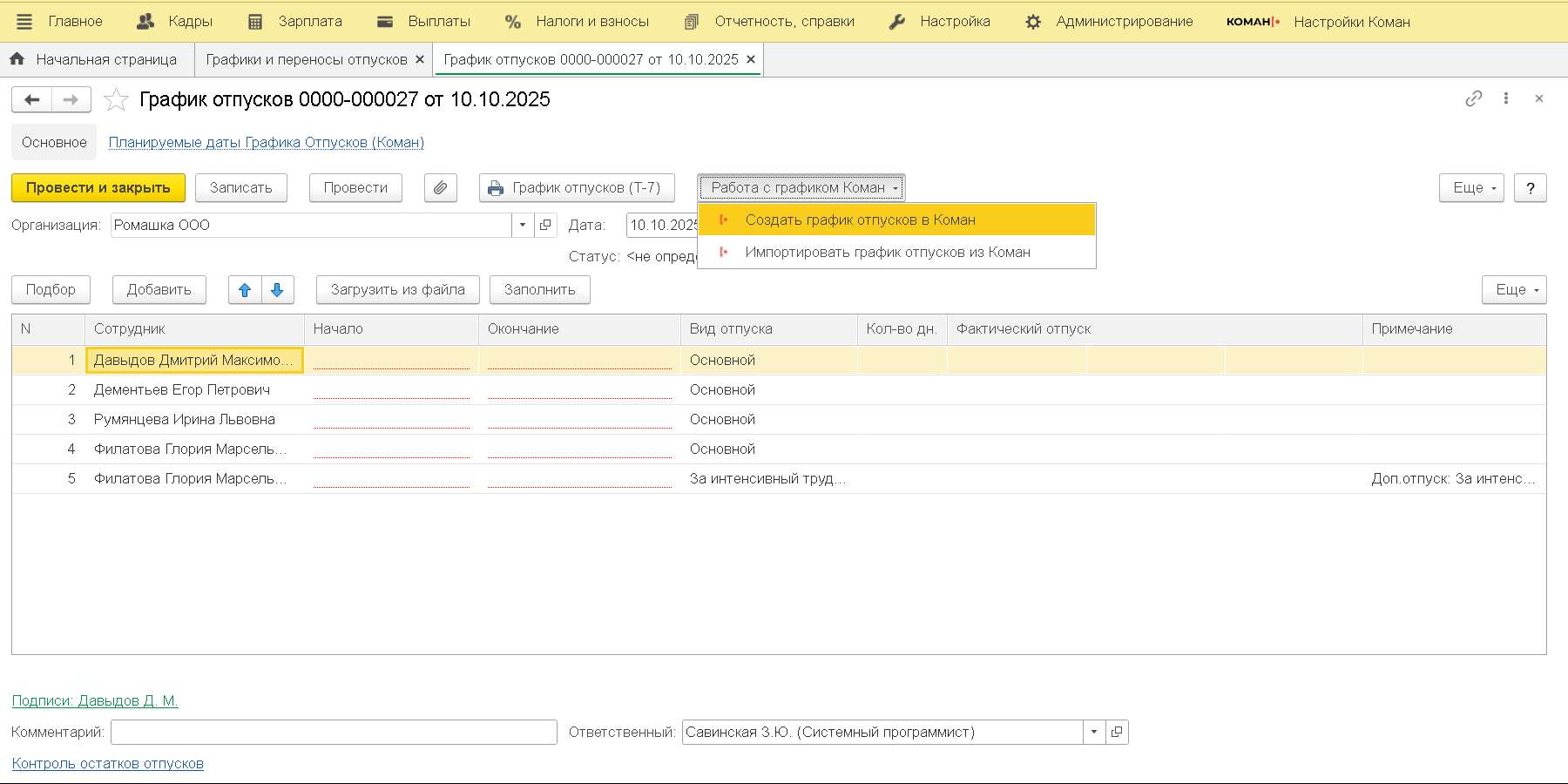Нажмите на кнопку "Работа с графиком Коман" / "Создать график отпусков в Коман".
