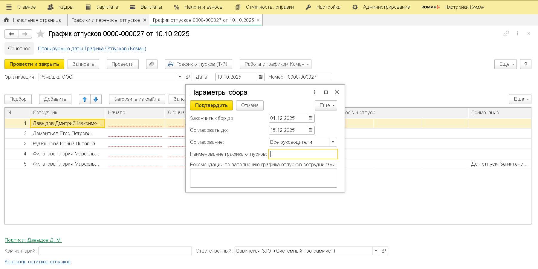 - "Наименование графика отпусков": в Коман сбор графика будет сохранен под этим названием