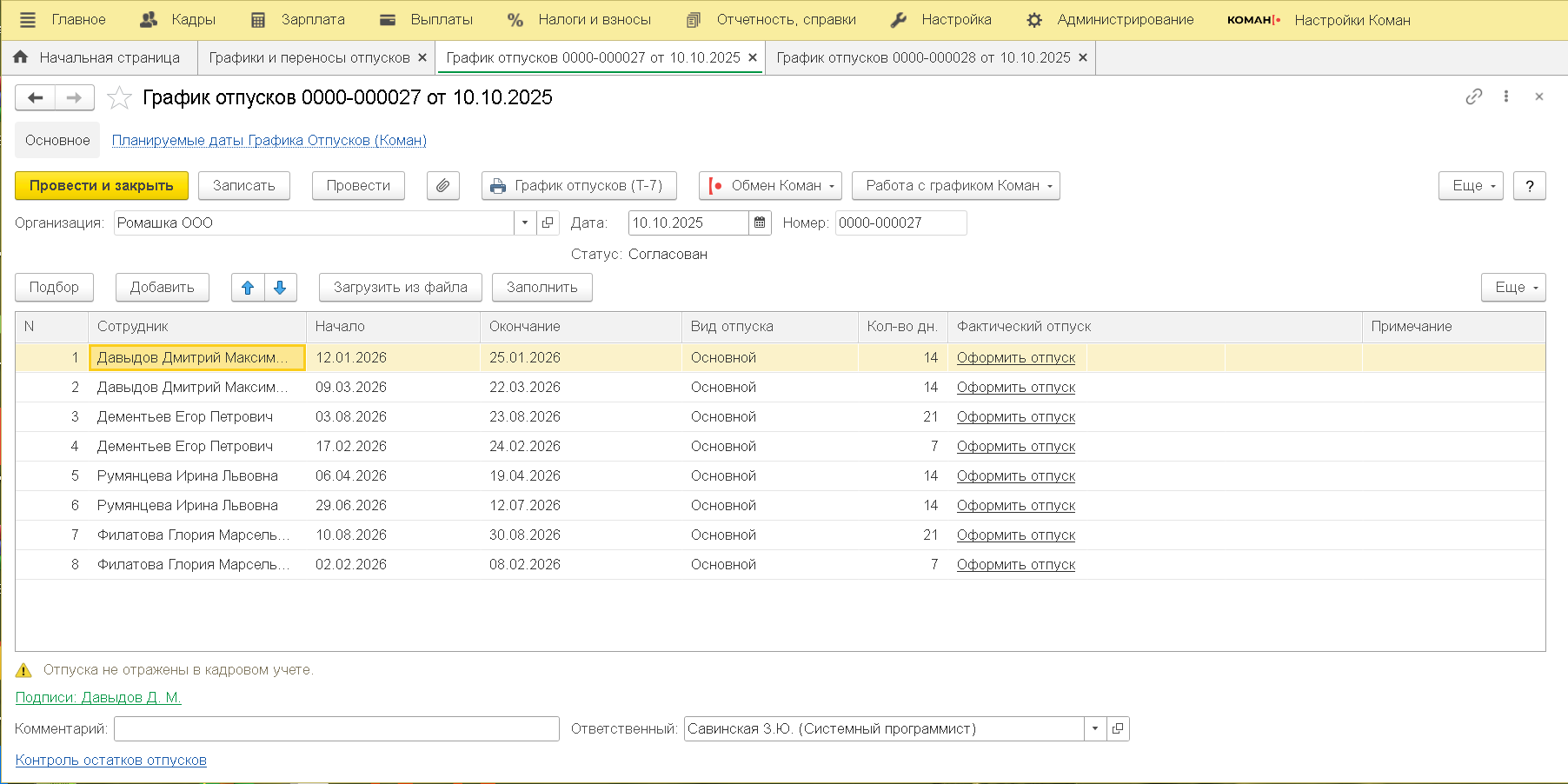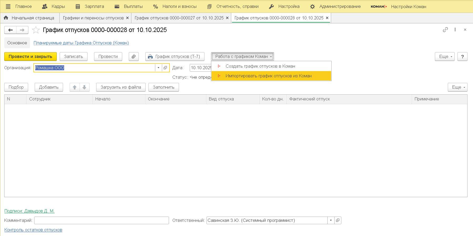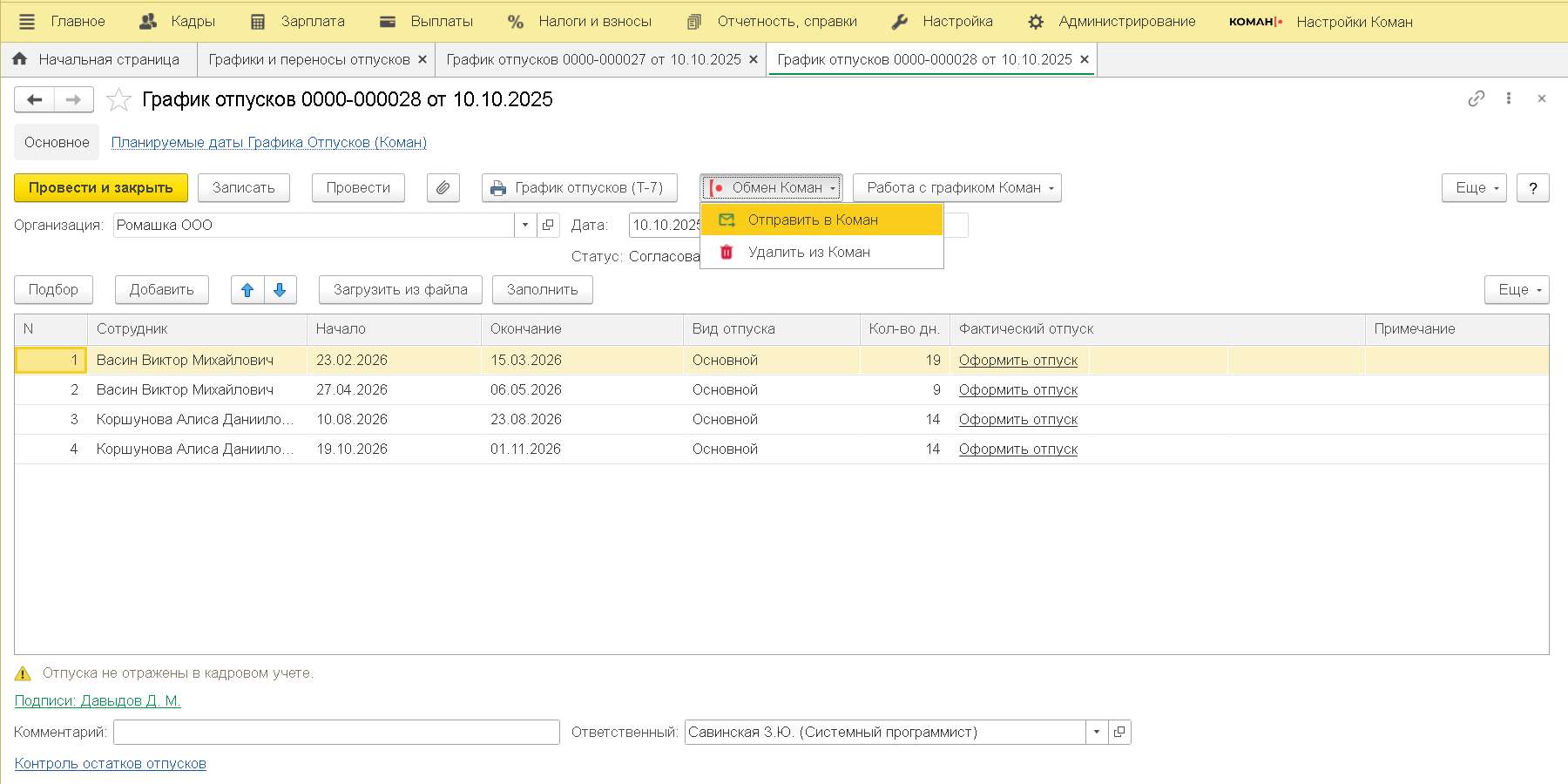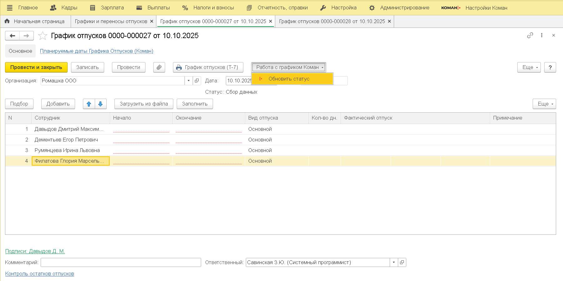 Откройте документ "График отпусков", из которого ранее создали сбор графика отпусков в Коман. Нажмите "Работа с графиком Коман"/"Обновить статус".