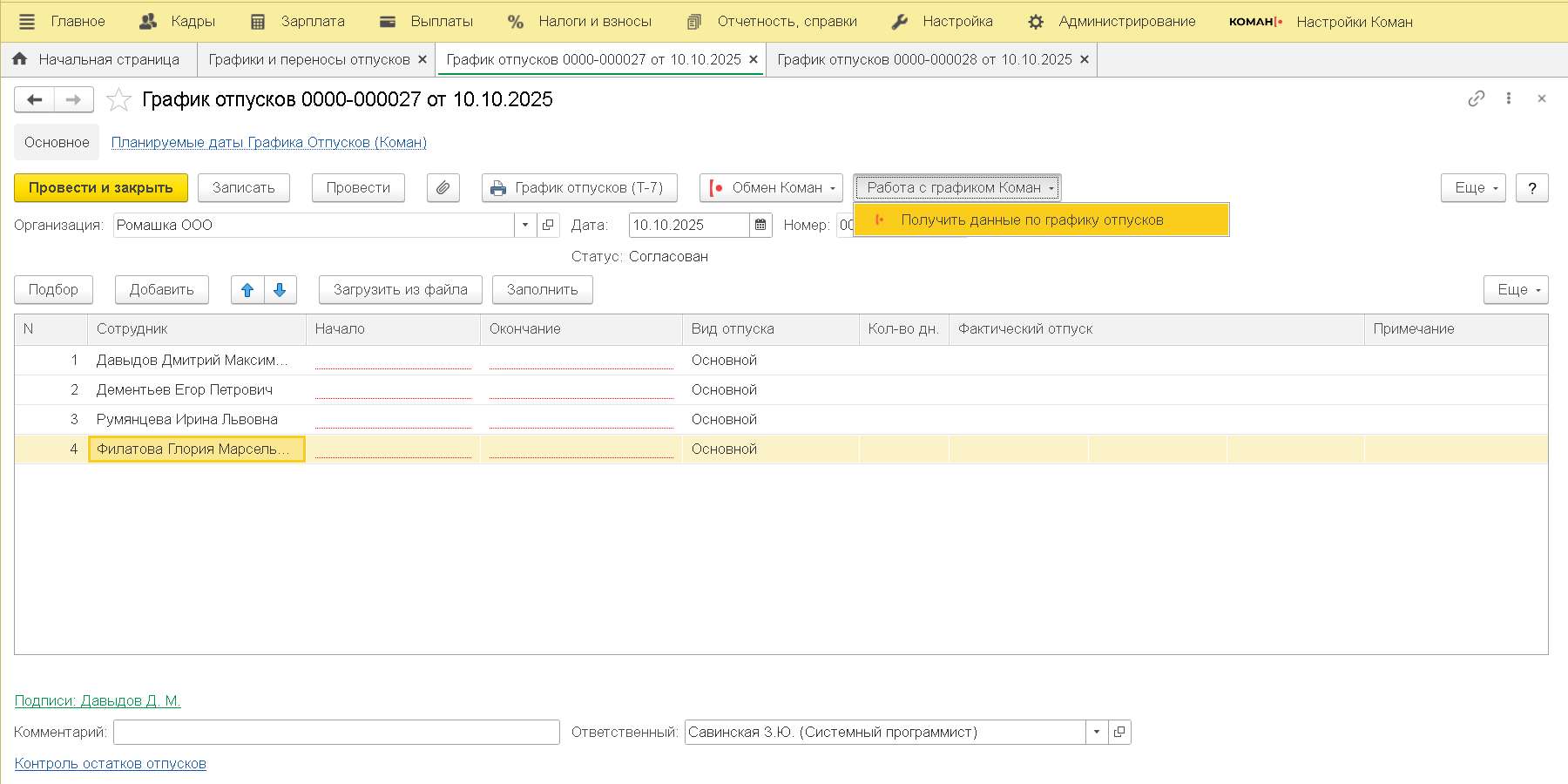 Если график отпусков в Коман согласован, то в меню "Работа с графиком Коман" появится кнопка "Получить данные по графику отпусков".