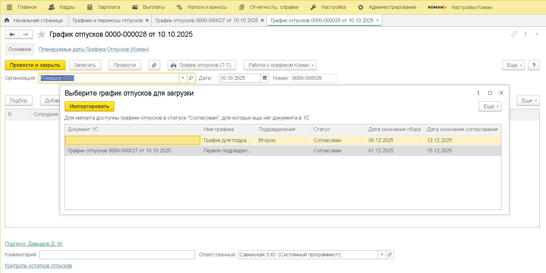 Выберите график отпусков для загрузки и нажмите "Импортировать". Данные загрузятся в документ.