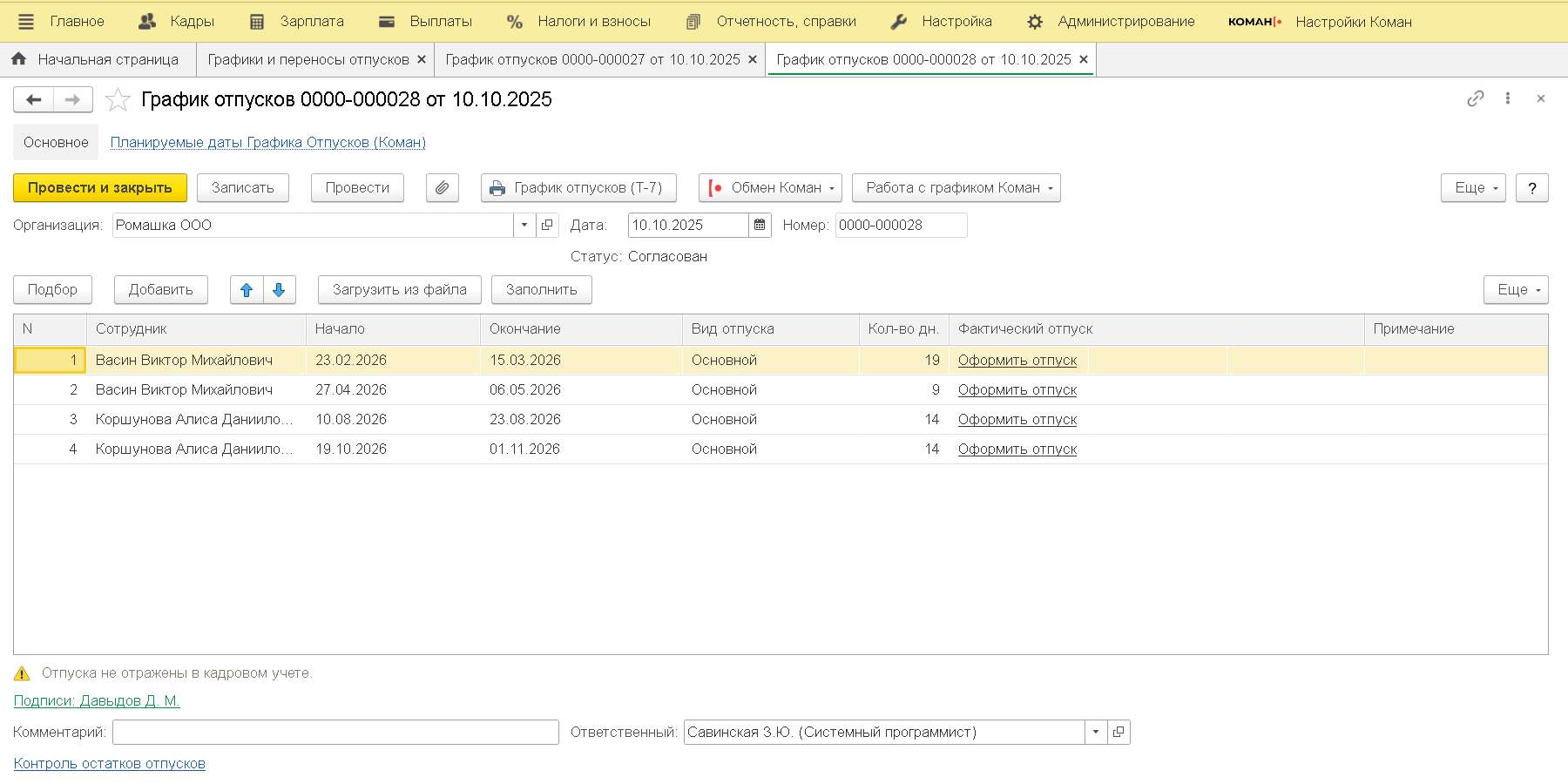 После отправки документа на подписание статус графика отпусков в Коман будет изменен, внесение изменений будет заблокировано.