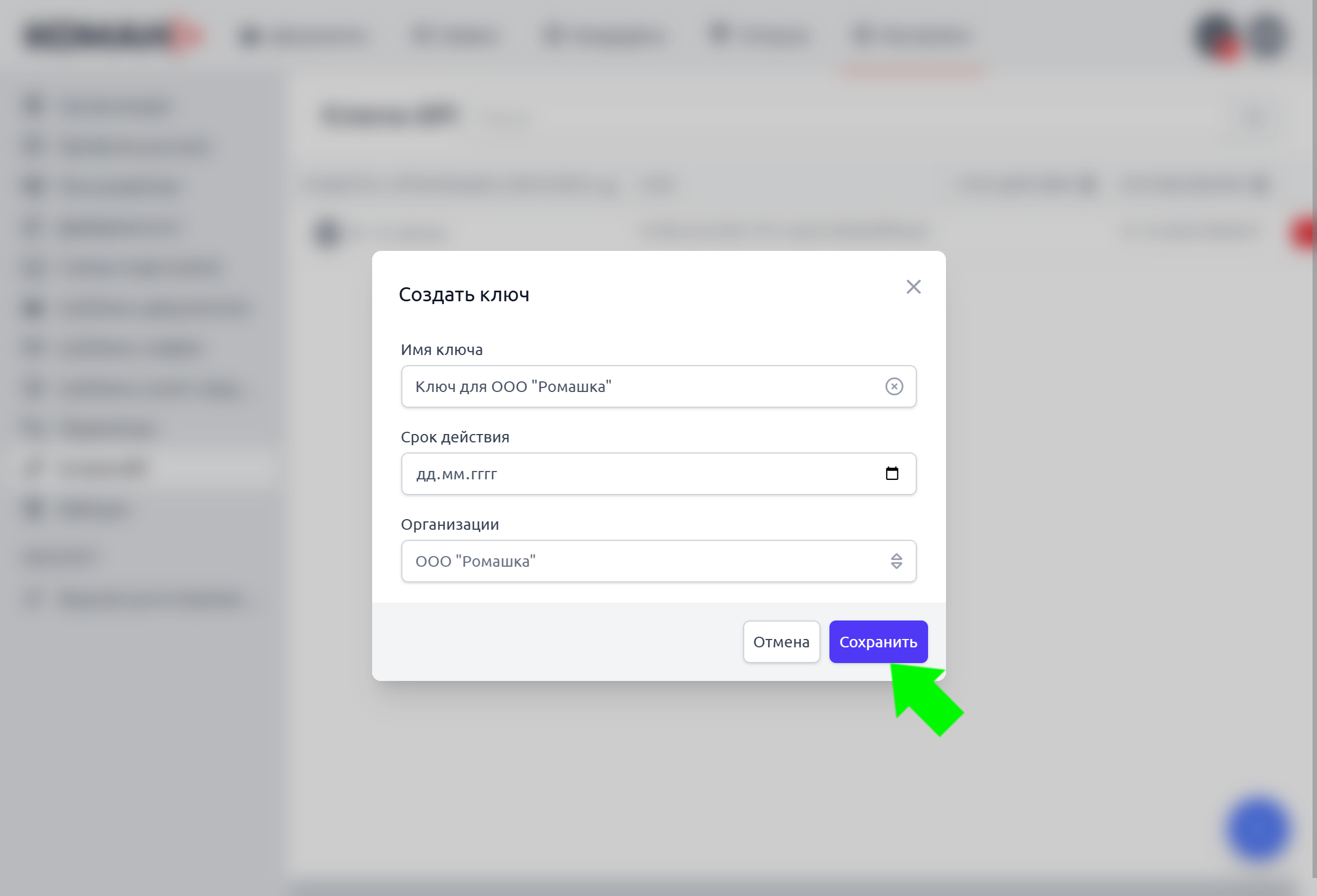 Нажмите «Создать ключ». Заполните необходимые поля, нажмите «Сохранить».