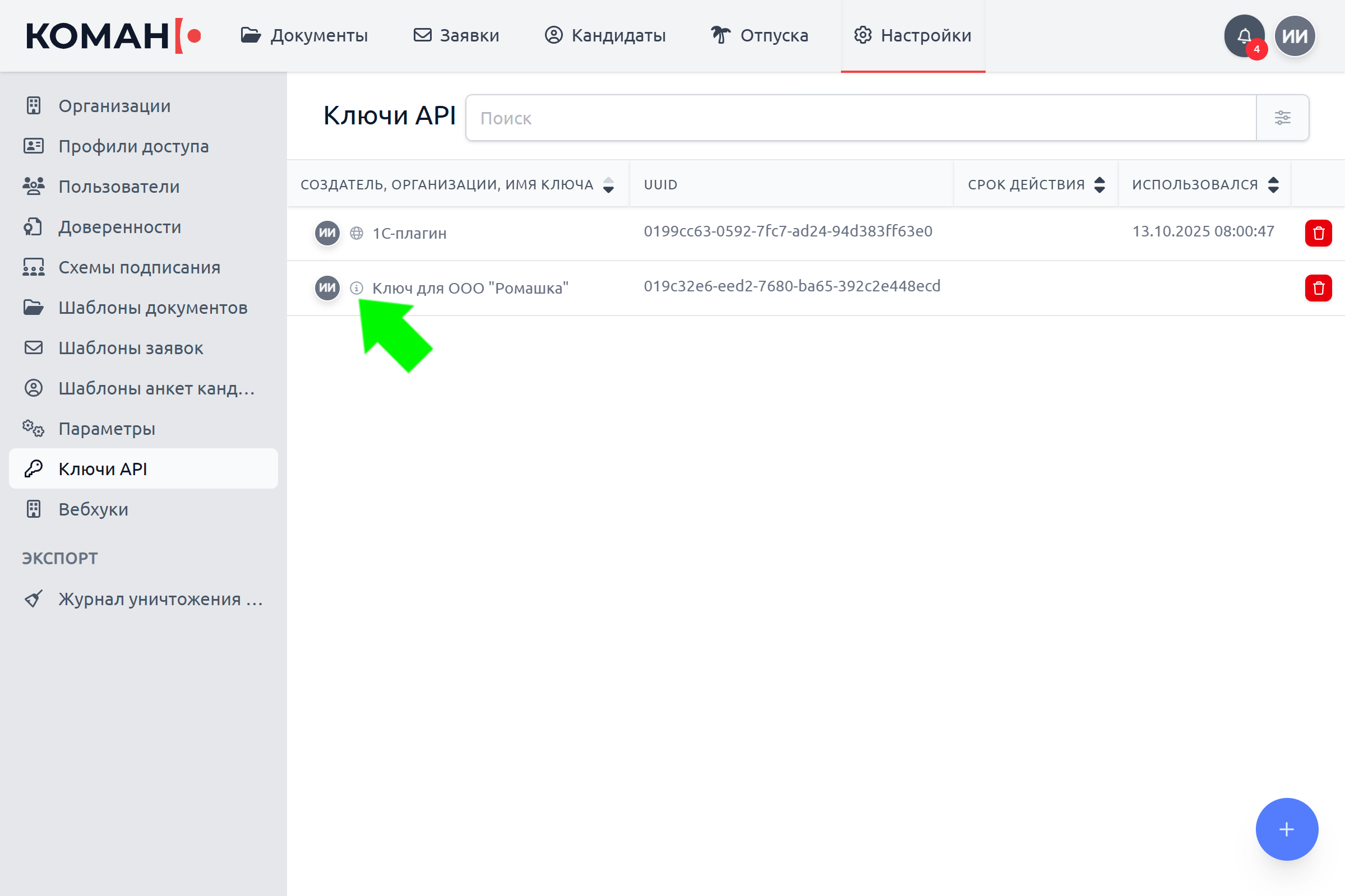В Коман создан новый ключ API . Скопируйте его и используйте при интеграционном обмене Коман с другими внешними системами.