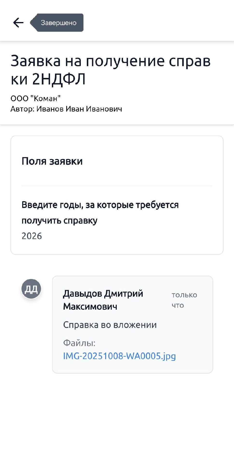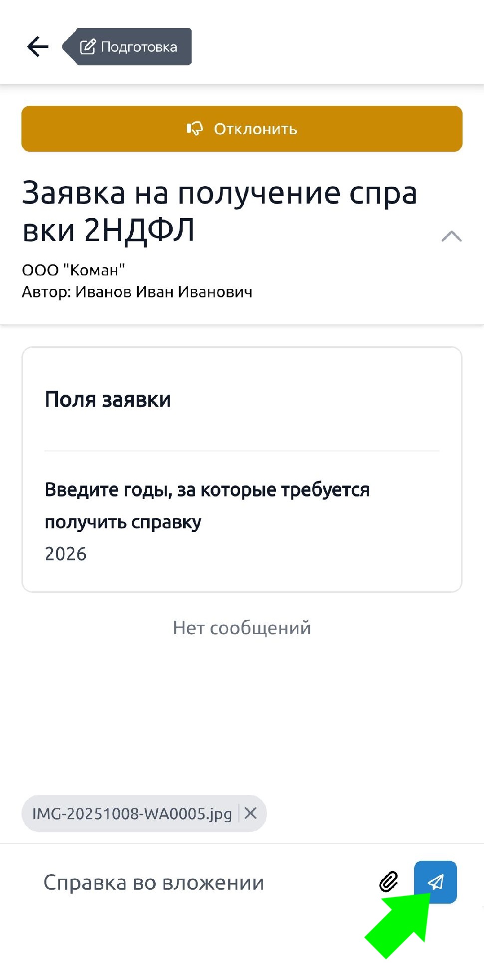 Для положительного ответа напишите сообщение и прикрепите файл. Нажмите на кнопку "Отправить". Заявка перейдет в статус "Завершено" и будет доступна на соответствующей вкладке.
