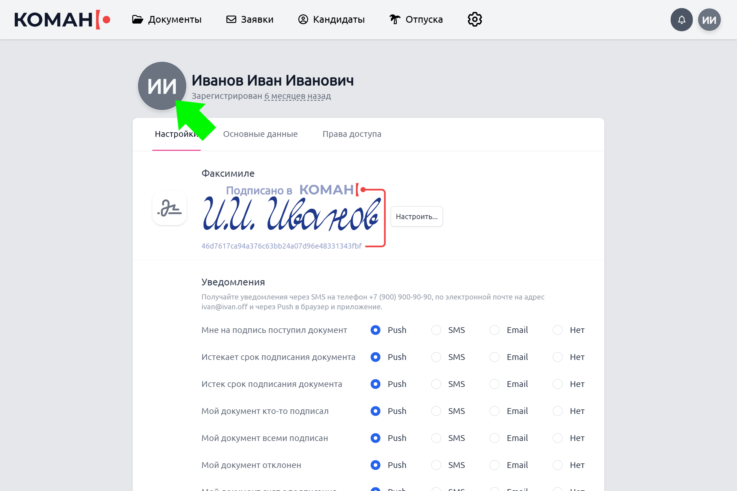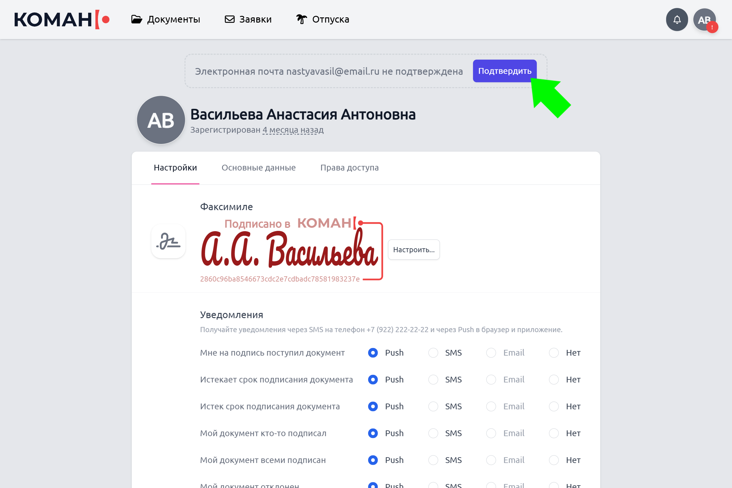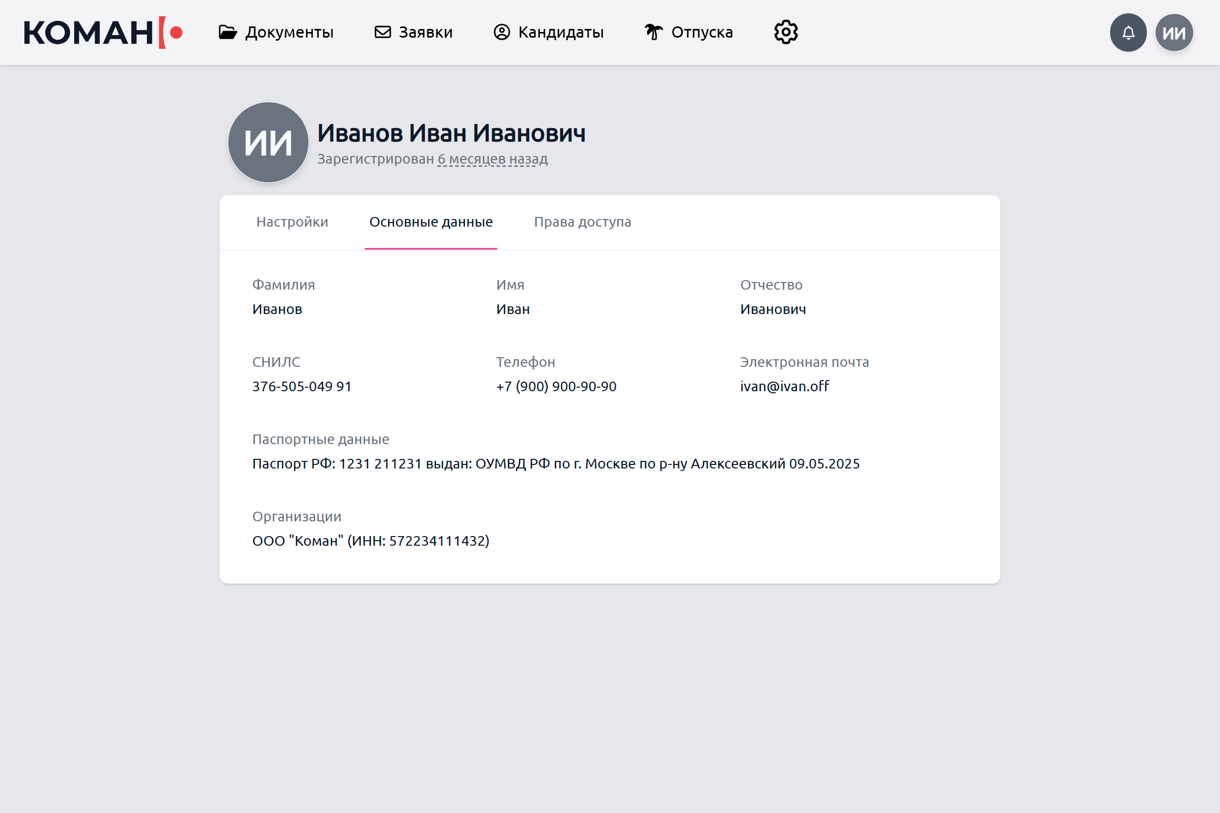 Нажмите на вкладку «Основные данные» для просмотра своих личных данных и организаций, к которым вы прикреплены в Коман.