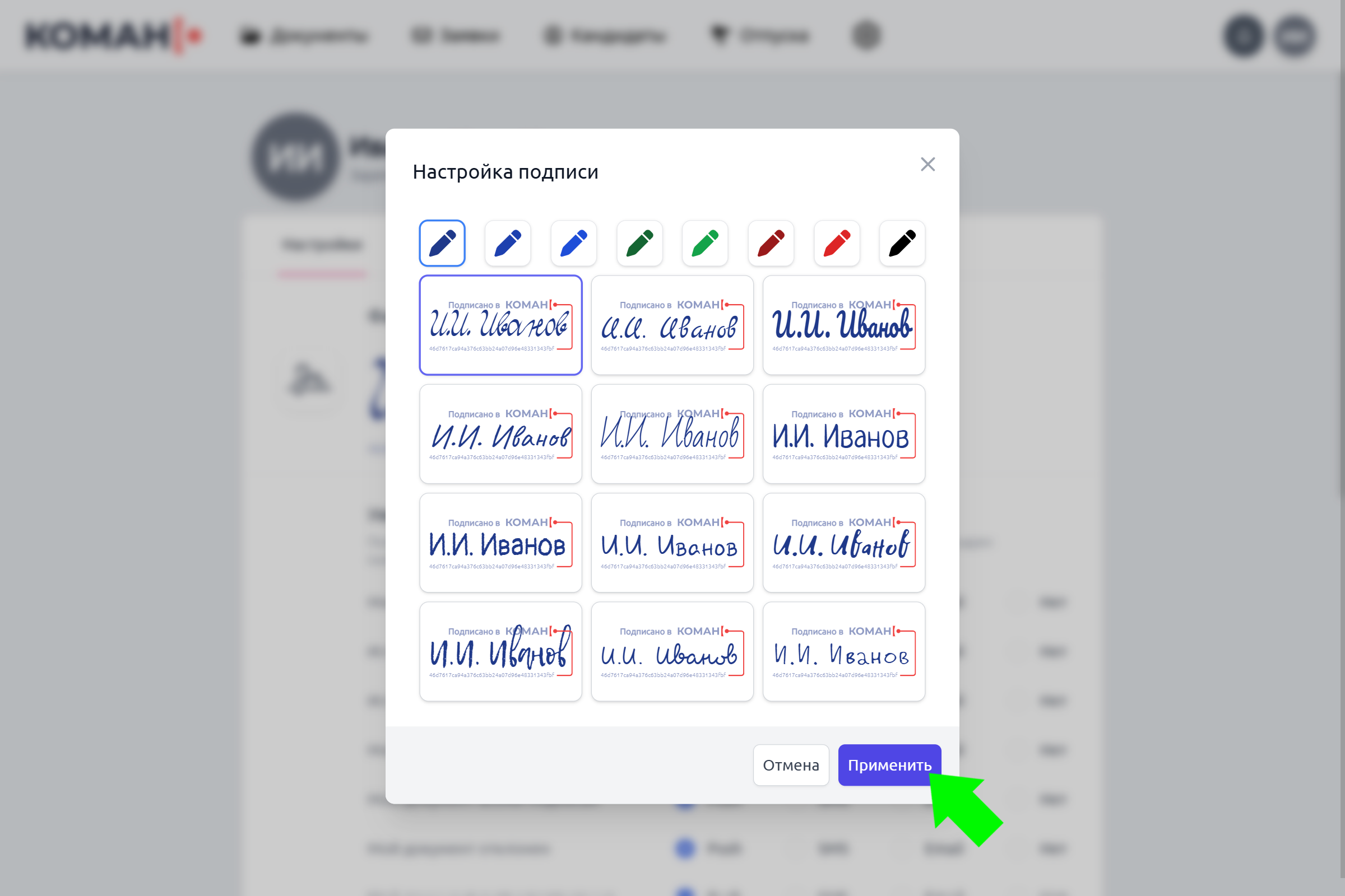 Нажмите кнопку «Настроить», выберите цвет и внешний вид Вашей электронной подписи