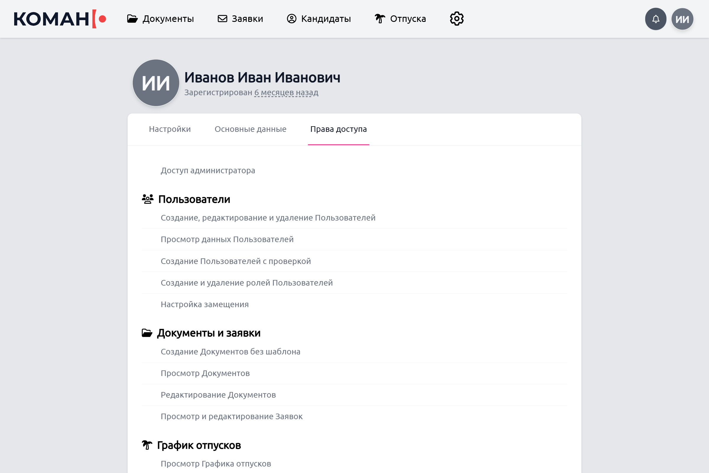 Нажмите на вкладку «Профиль доступа» для просмотра доступных вам функций.