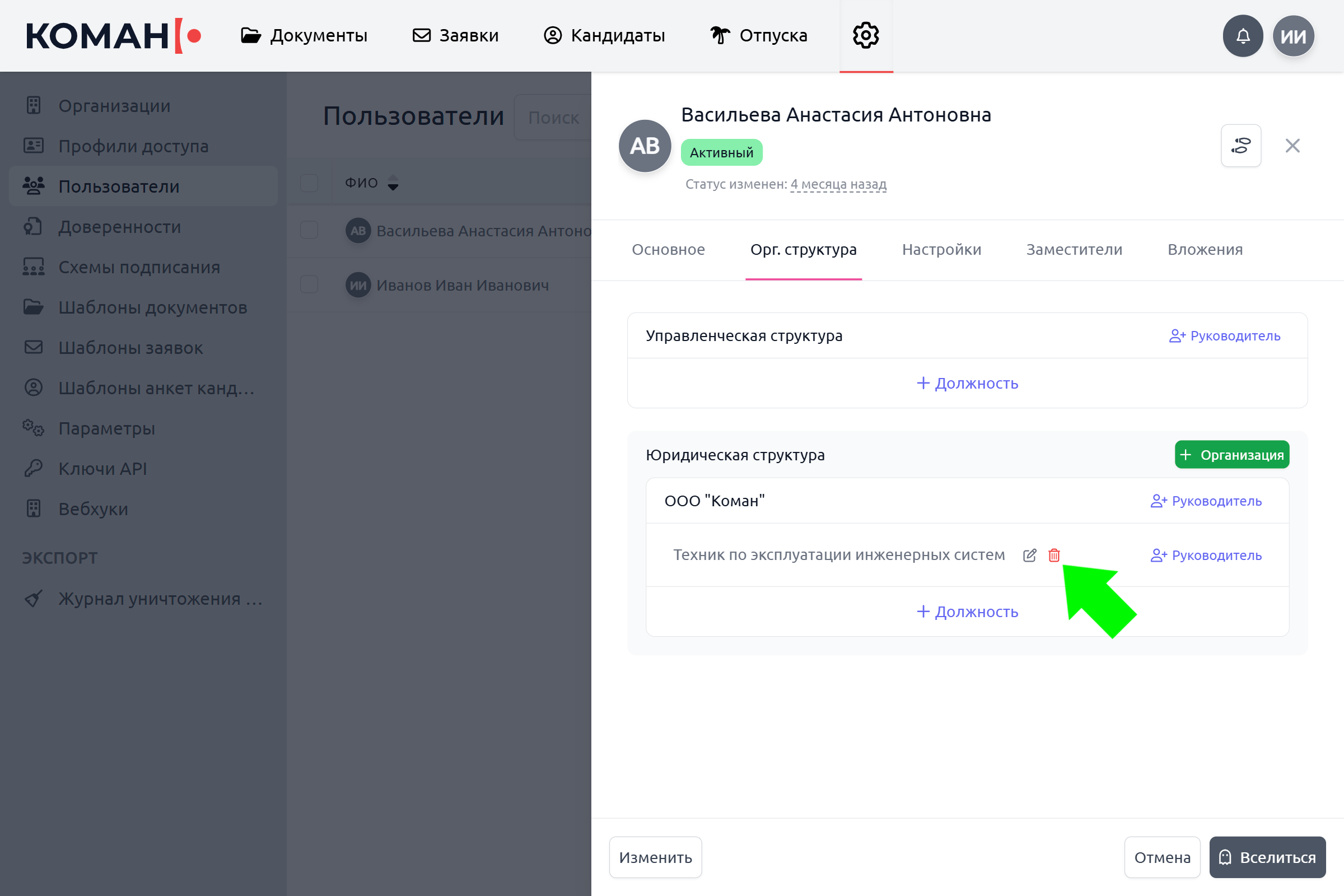 После удаления из организации пользователь автоматически удаляется из "Руководителя" у всех пользователей, у которых он был указан в качестве Руководителя в этой организации. Документы пользователя сохраняются в Коман после его удаления.