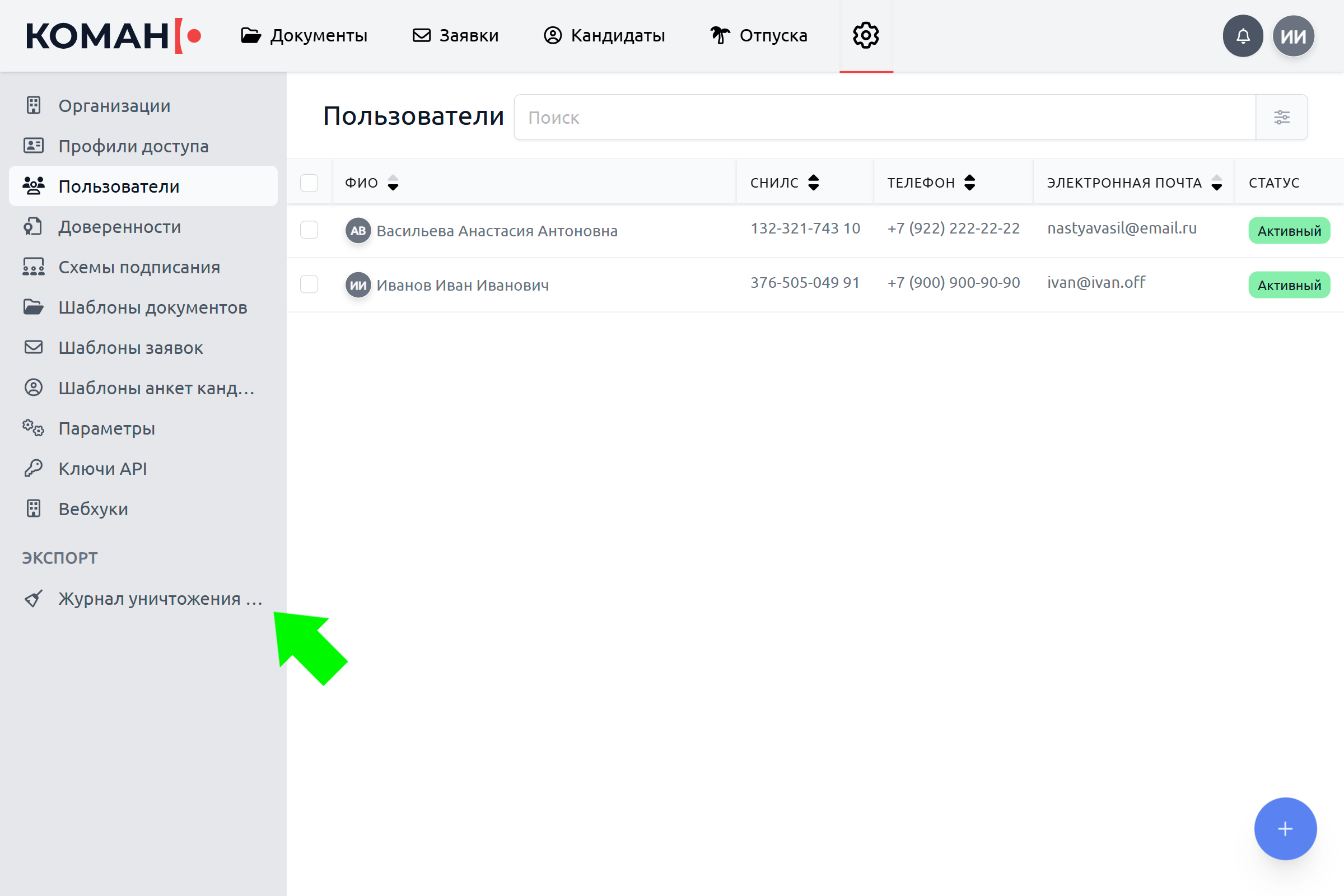 Перейдите в "Настройки" и левом меню в разделе "Экспорт" нажмите "Журнал уничтожения данных".