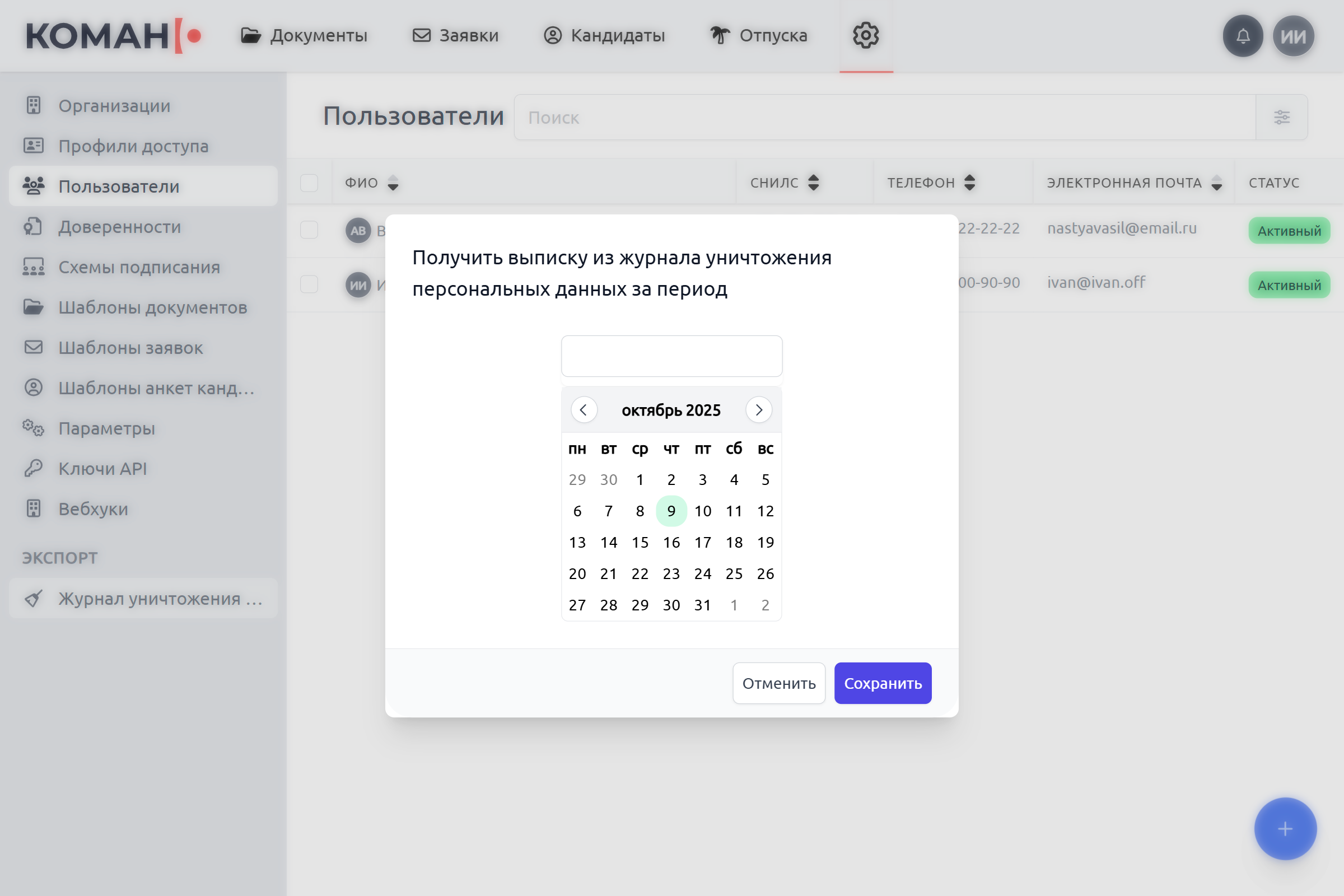 Выберите даты, за которые хотите получить журнал и нажмите "Сохранить". Будет загружен Excel файл журнала уничтожения данных за указанный период.