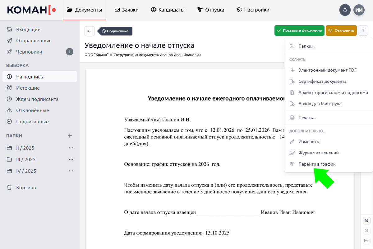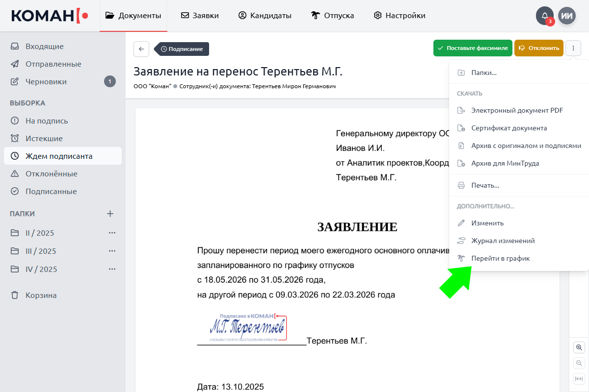 Вам на подписание поступил документ "Заявление на перенос отпуска". Откройте документ и нажмите "Перейти в график".