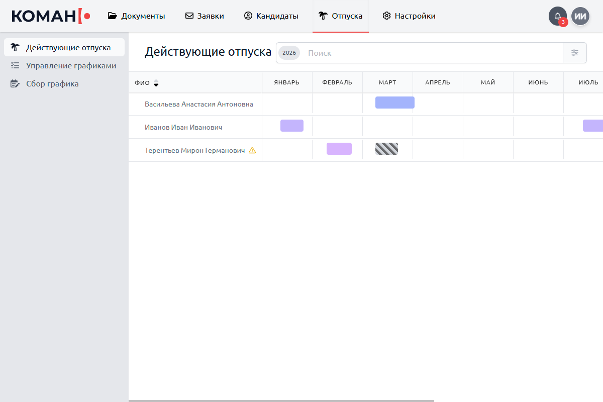 Вы можете проверить пересечения отпусков ваших подчиненных: новые периоды отпуска показаны штриховкой.