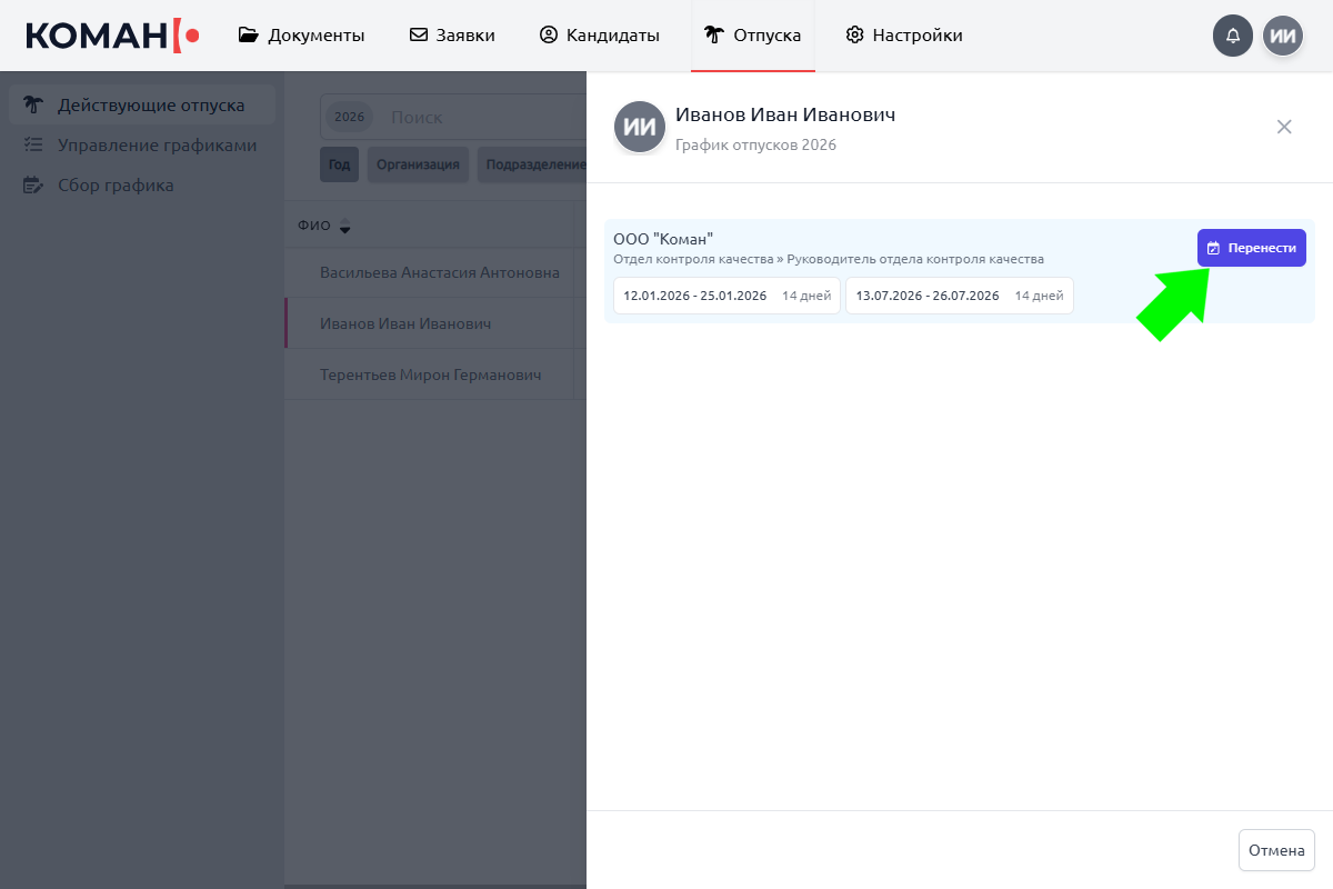 Если у вас есть запланированный отпуск, доступный для переноса, внизу экрана доступна кнопка "Перенести".