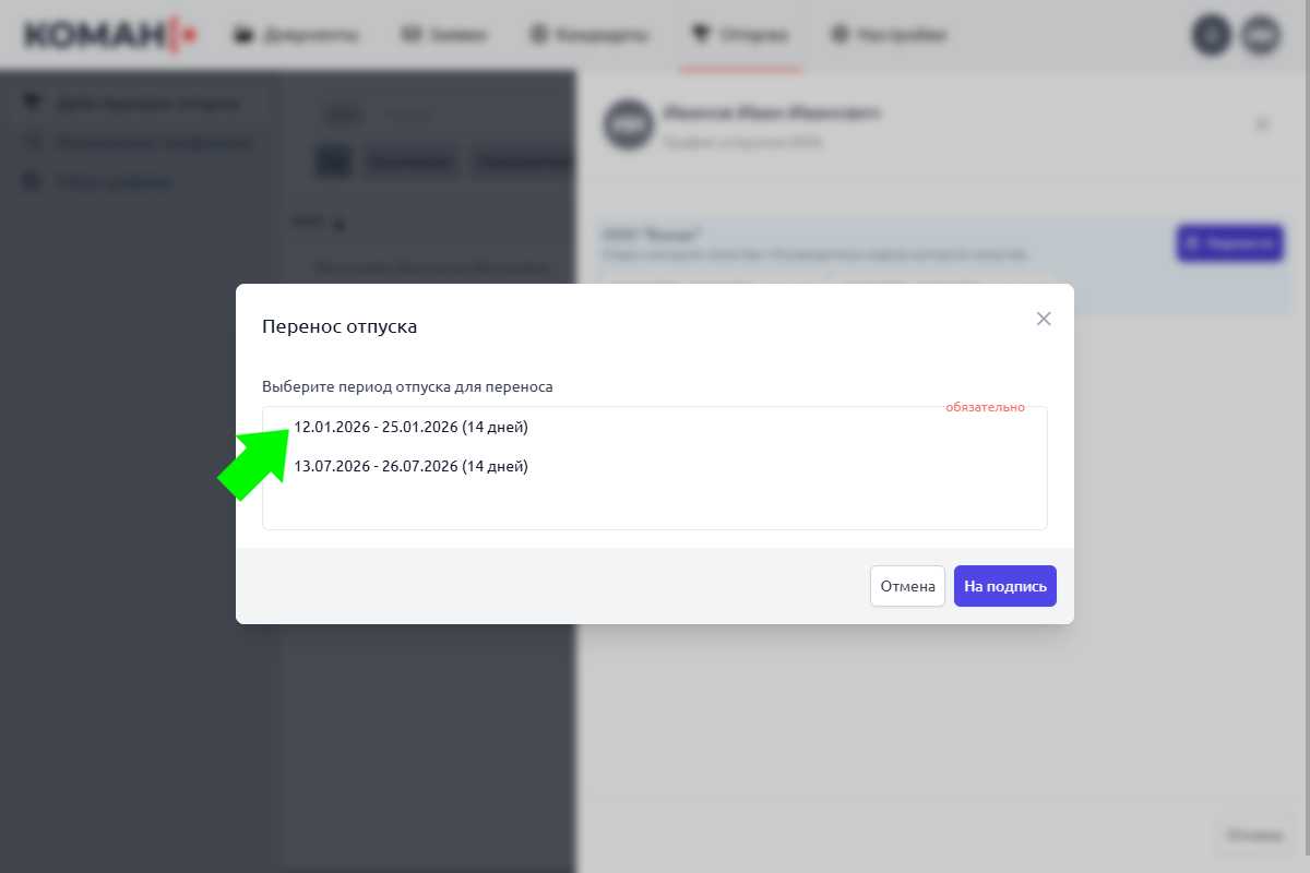Выберите периоды отпуска для переноса, укажите новые даты отпуска и нажмите "На подпись".