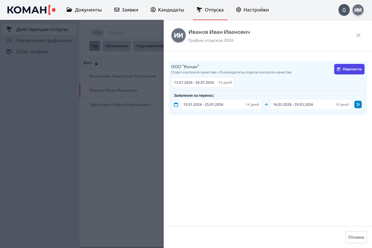 После того, как заявление на перенос отпуска будет полностью подписано, в графике отпусков будут отражаться только новые периоды отпуска. Если заявление будет отклонено, в графике отпусков будут отражаться старые периоды отпуска.