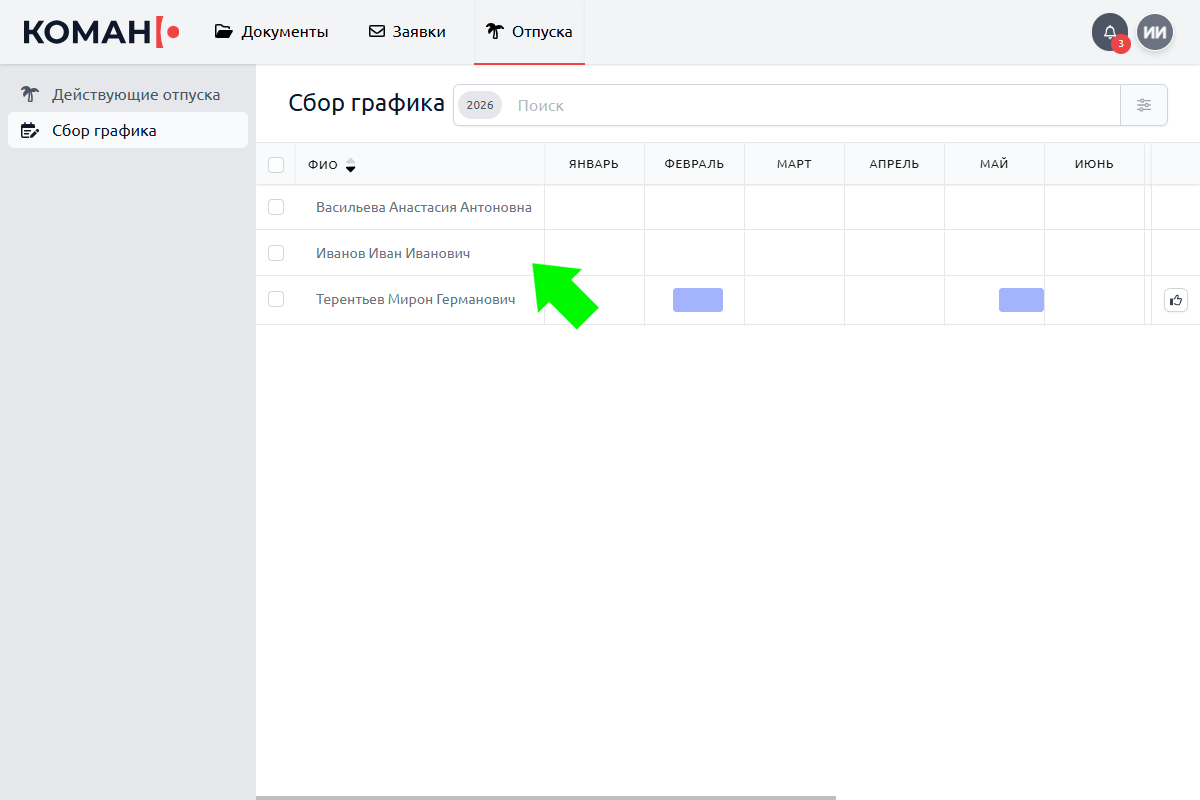 Вы можете согласовать отпуск своему сотруднику в меню "Сбор графика".