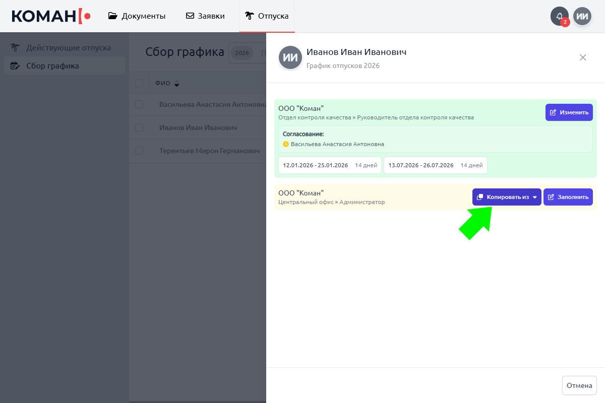 Если Вы уже заполнили график отпусков по одной должности, а после Вас добавили в график по другой должности, вы можете копировать заполненные ранее периоды.